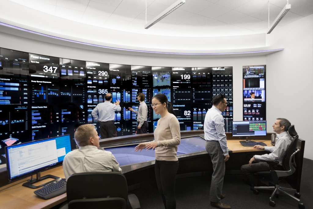 Gold Bridge Capital Risk Management Center provides a comprehensive view of the various investment portfolios and how they fit within pre-established guidelines. Built in 2014, its front-end consists of a 27' by 8' interactive touchscreen designed to visualize data in ways that allow for rapid comprehension. Its back-end systems, which connect to every Gold Bridge Capital office worldwide, continuously run a wide range of operational readiness, risk, and stress test monitors.